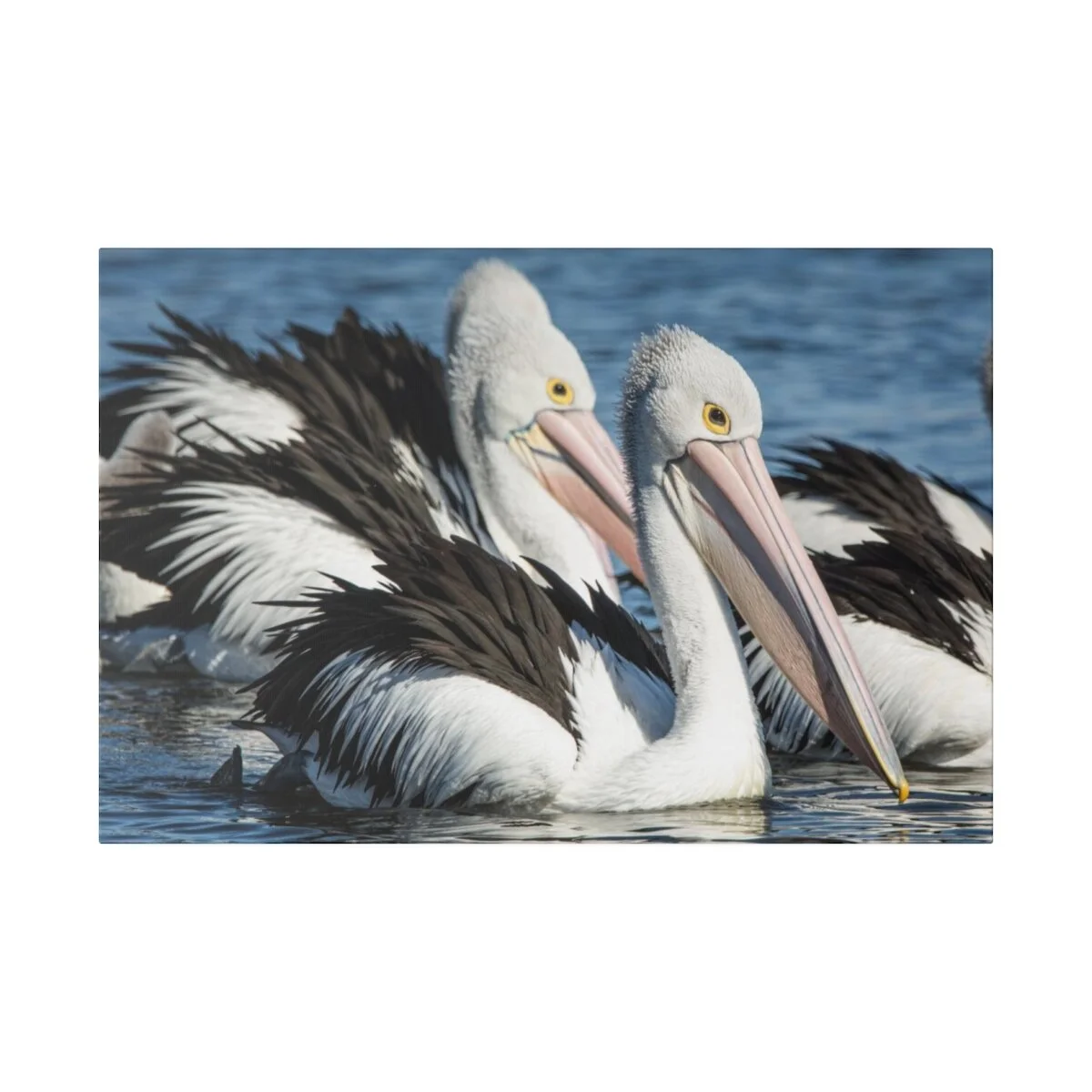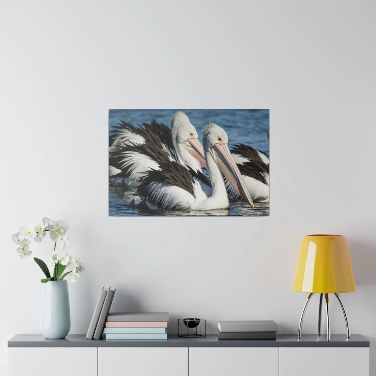 Australian Pelicans. Each matte canvas comes with back hanging already included for convenient placement. The frame is made with profile radial pine that is ethically sourced from renewable forests.